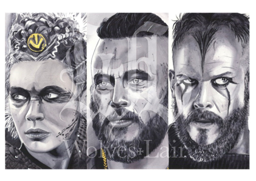 Lagertha, Ragnar and Floki, from an original watercolour. Printed on 300gsm hahnémühle fine art German etching paper.